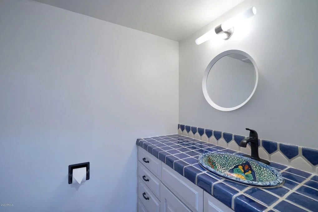 Powder room - Removal of floor to ceiling fabric on walls, painting cabinets and adding new hardware and fixtures to simplify color palette. Created a spacious, clean look.