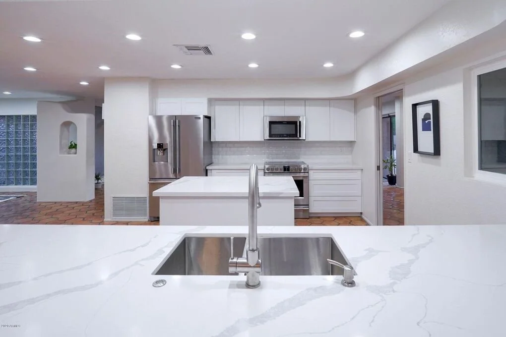 Overhaul of kitchen layout. Redesigned entire kitchen including island, cabinets and appliance placement. Removed and lowered the barrier behind the sink to create an open feel with the ability to place bar stools on opposite side of the large, open counter top. Turned the area into an entertainer’s kitchen.